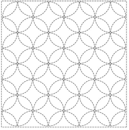 The Sashiko pattern known as Seven Treasures has a diverse and intricate history. Its geometric design incorporates four ellipses within a circle, creating additional circles within the pattern. The term “Shippo” is a nod to precious stones in Buddhism and reflects the gleaming appearance of the circles’ interiors. This pattern is frequently paired with flowers in sashiko embroidery. The intersecting circles in this design create a flowing geometric effect that has been used to convey enduring peace and happiness and as a charm for boundless fertility and family prosperity.